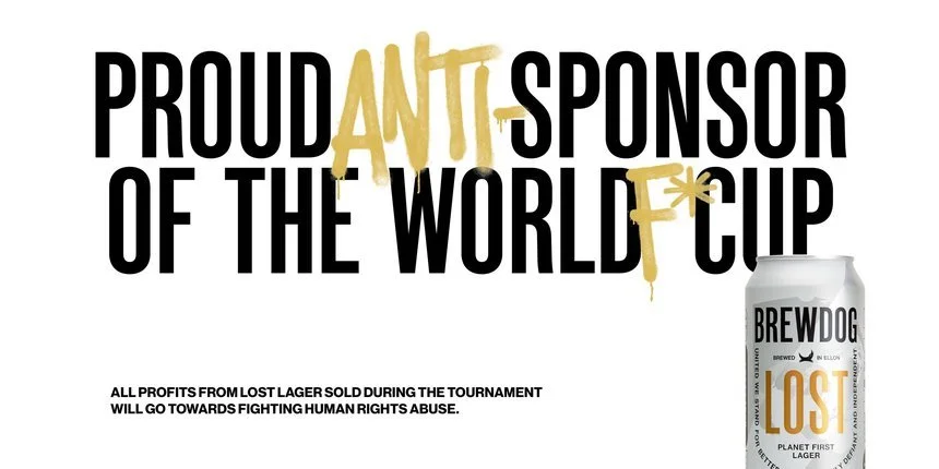 Brewdog couldn’t afford to sponsor 2022 World Cup but wanted to be part of it. Our solution: sponsor the game, not the event. Point out that FIFA and Qatar are dragging it through the mud.